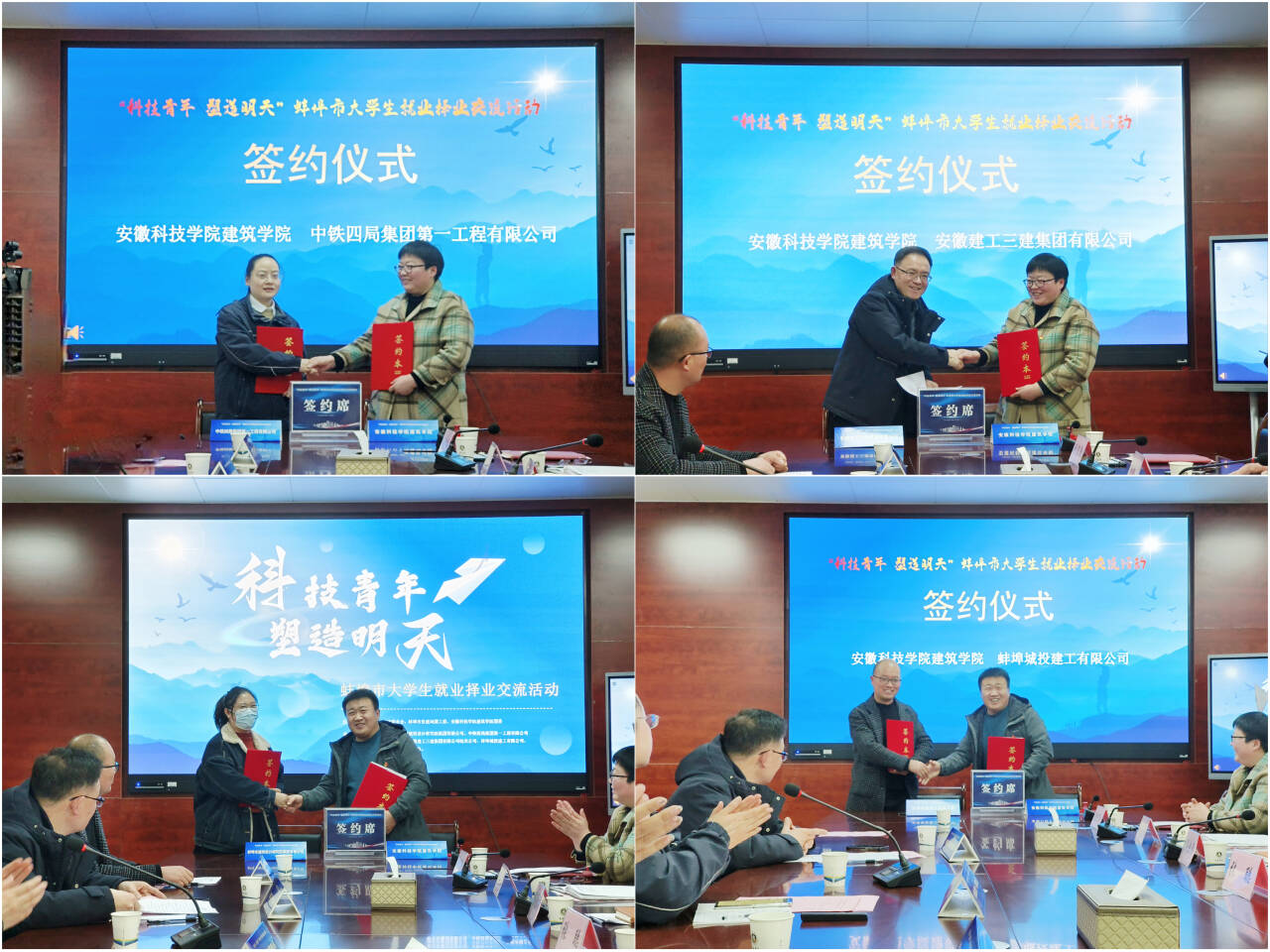 会上,建筑学院党委副书记谢宜勤、副院长张伟分别与中铁四局集团第一工程有限公司、安徽建工三建集团有限公司、蚌埠市建筑设计研究院集团有限公司、蚌埠城投建工有限公司等企业签订《毕业生就业实习基地建设协议》。