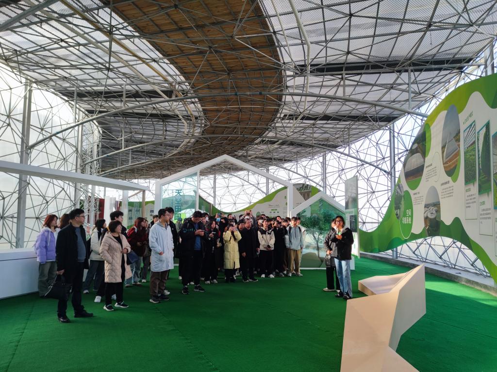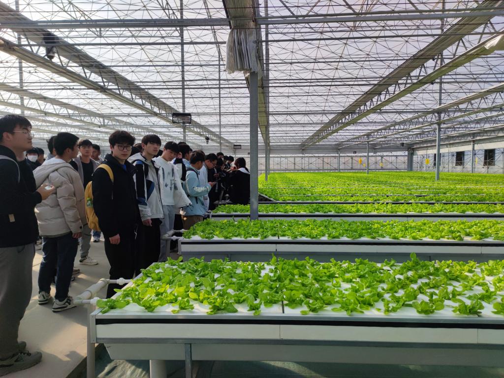 园区经理沈旭热情接待了农学院师生,并向大家介绍了太空农场的建设理念、规模、种植模式及发展思路等。在工作人员的带领下参观了土楼形科普体验温室、金字塔形科技展示温室、以及鸟巢形植物工厂温室等现代化农业设施及智能化栽培管理模式。