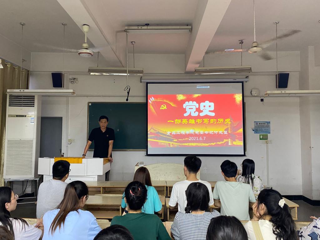 6月7日晚,食品工程学院于求知楼A301进行了一场别开生面的主题党课,本次党课由食品工程学院党委书记付光玺主讲,食品工程学院党政办主任赵传磊、专职辅导员吴玘及学院全体学生党员参会。