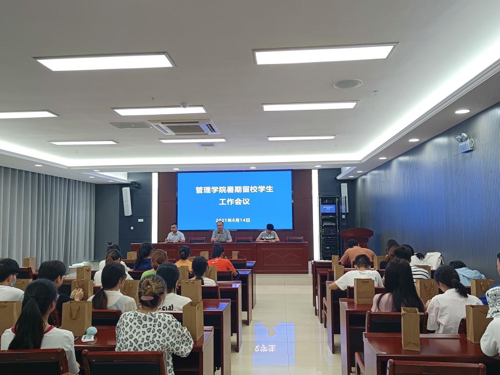 8月14日下午,管理学院在龙湖校区西辅楼111会议室召开暑期留校学生工作会议,学院党委书记丁景良、党委副书记陶漫及全体专兼职辅导员出席会议,全体留校学生参加会议,会议由党委委员、党政办公室主任李永鹏主持。