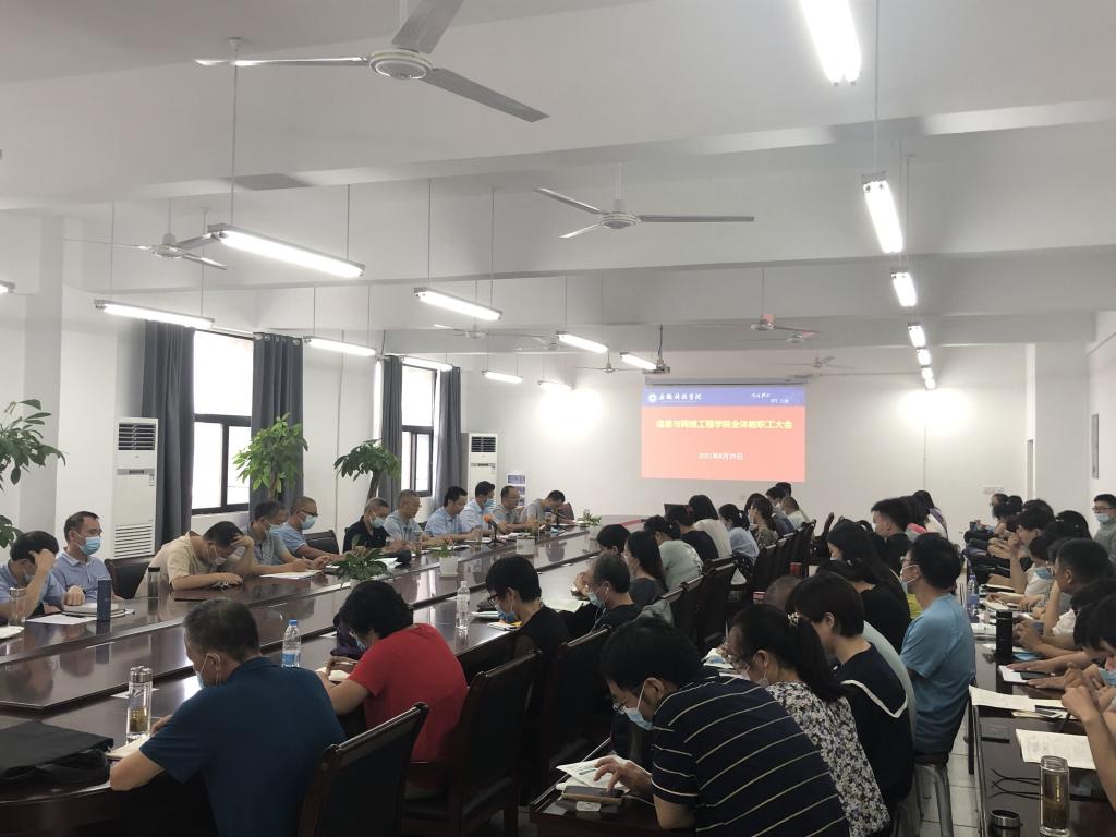 为保障新学期各项工作的顺利开展,8月29日下午,信息与网络工程学院在尚行楼B418召开教职工大会,学院党政班子成员和全体教职工参加会议,会议由院长余宏杰主持。