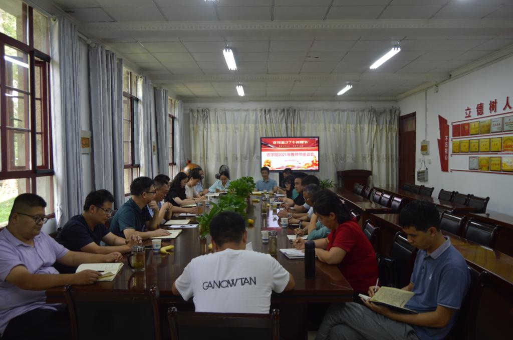 立志永远跟党走,立德树人新时代。为庆祝第37个教师节,同心合力共谋学院发展,9月8日下午,农学院在学院会议室召开以“欢度节日、共谋发展”为主题的2021年教师节座谈会。学院党委委员、班子全体成员、分工会主席、中老年教师代表及2017年1月1日以后来校、来院工作的教师出席了座谈会。座谈会由学院党委副书记、院长崔广荣主持。