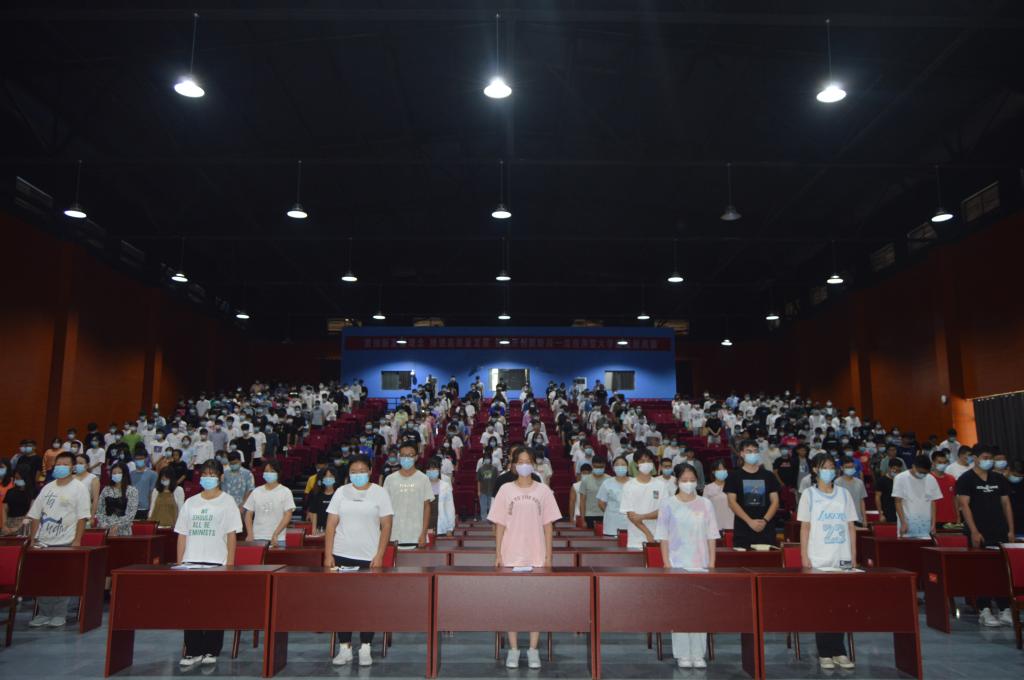 会议进行到9点18分时,随着防空警报响起,全体师生中断会议,默然肃立,共同悼念为中华民族独立和人民解放而英勇献身的革命先烈、缅怀罹难同胞。主持人何世潮指出,今天的入学教育大会不仅是一次专业教育、爱校教育,还是一次生动的爱国教育,希望全体师生“铭记历史,不忘国耻;努力学习,报效国家”。