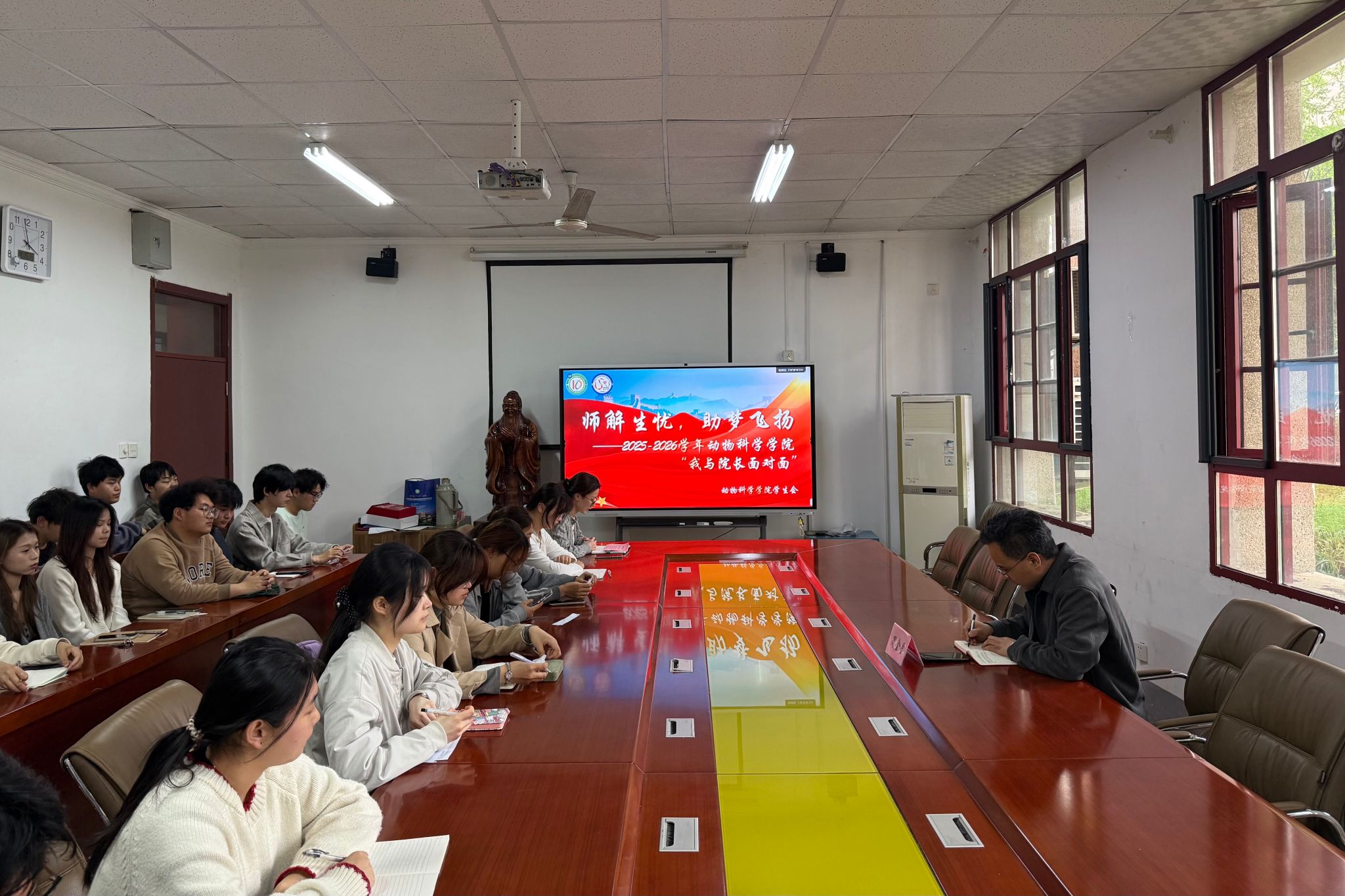 为深入落实“以学生为中心”育人理念,精准回应学生成长需求,4月15日下午,动物科学学院学生会在西办104室举办“我与院长面对面”座谈会。学院党委副书记、院长周金星与学生代表齐聚一堂,围绕与学生成长发展密切相关的问题开展深入交流,面对面解疑释惑、心贴心共话发展,座谈会由辅导员郭育妍主持。