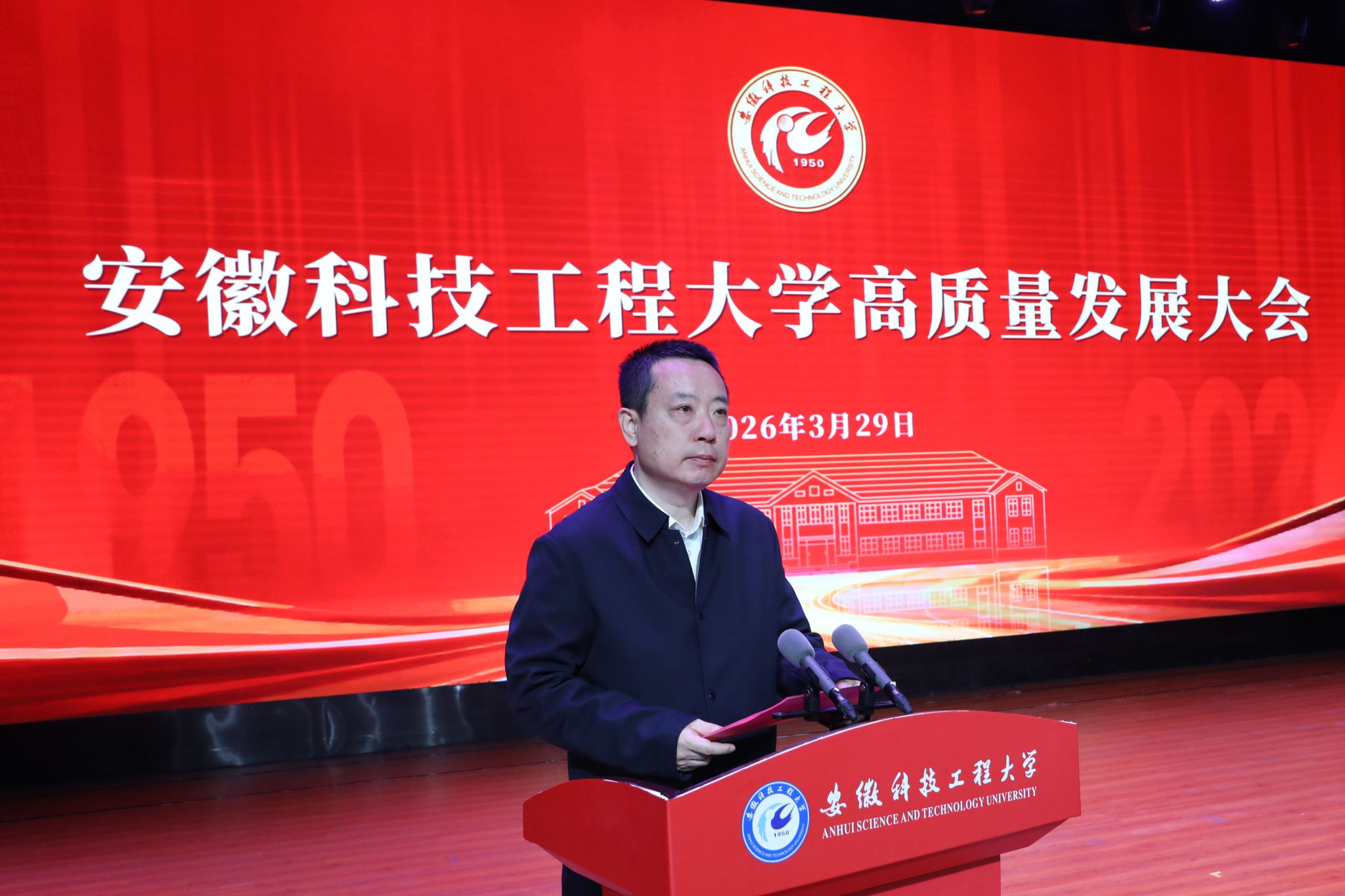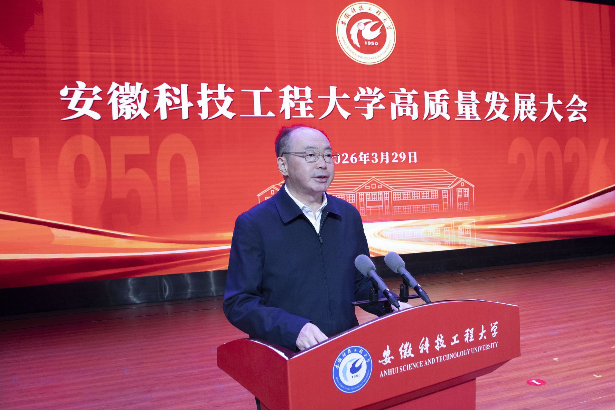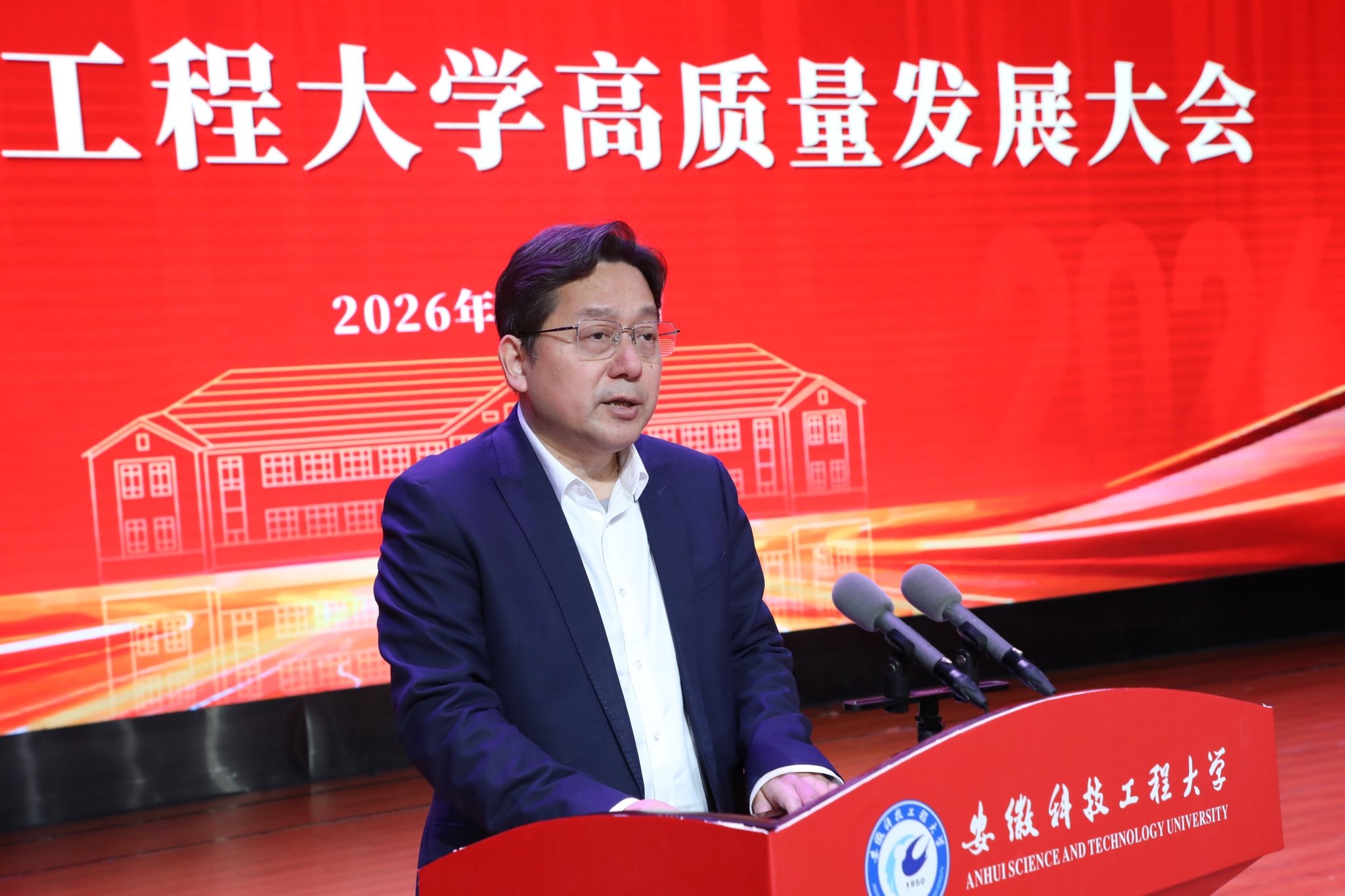 滁州市委副书记、市长胡春华在讲话中代表滁州市委、市政府向学校成功更名表示诚挚祝贺。他指出,安徽科技工程大学自1950年建校以来始终扎根江淮大地,为地方经济社会发展作出积极贡献。近年来,学校锚定现代化全国一流应用型大学目标,顺利实现从学院到大学的跨越,是学校发展史上的里程碑,也让滁州人民倍感自豪。他强调,学校与滁州同频共振、共生共荣,“十五五”时期校地合作前景广阔。希望学校深化产教融合,推动创新成果就地转化、优秀人才留皖兴业,共同书写双向赋能新篇章。他表示,滁州市将一如既往支持学校发展,为现代化新滁州建设赋能添彩。