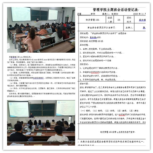 为进一步促进学生德智体美劳全面发展,强化学生综合素质测评的导向和激励作用,学院各非毕业班于近日召开了学习2020版学生综合素质测评办法主题班会。