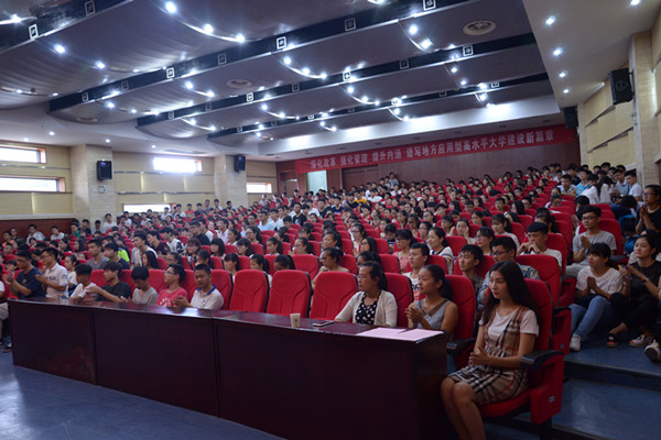 学院党总支书记、副院长骆海邦致欢迎辞并作动员讲话。他首先代表全院师生对2016级新生表示热烈的欢迎和衷心的祝贺,向全体新同学介绍了学校及学院的发展历史和基本情况,并就新生如何度过大学四年学习生活从四个方面谈了自己的看法和意见:一是正确认识大学的功能和任务;二是认真思考为什么要上大学;三是科学制定大学期间的目标任务;四是如何有意义得度过大学生活。他指出,大学的功能在于人才培养、科学研究、社会服务、文化传承,立德树人作为教育的根本任务,既要传授知识、培养能力,还要引导学生树立正确的世界观、人生观、价值观。对于大学生个体来说,大学是人生长河里的关键一站,是实现人生理想的快捷通道,是培养兴趣、彰显个性的理想乐园,是寻求志同道合事业合作伙伴的最佳场所,所以,大学生应以学业为主,同时注重加强较高的政治品德、良好的社会公德、忠实的职业道德、高尚的生活美德、敢于担当的社会责任感、敢为人先的创新精神、敢于动手的实践能力等方面的素质养成,使自己全面发展、成长成才。最后,他对全体新生提出了四点希望和要求:一是尽快适应大学生活,完成好角色转换。二是尽早明确目标,做好学业规划。三是以学业为主,自觉养成自主式学习、探究式学习良好习惯。四是全面发展,成长成才。