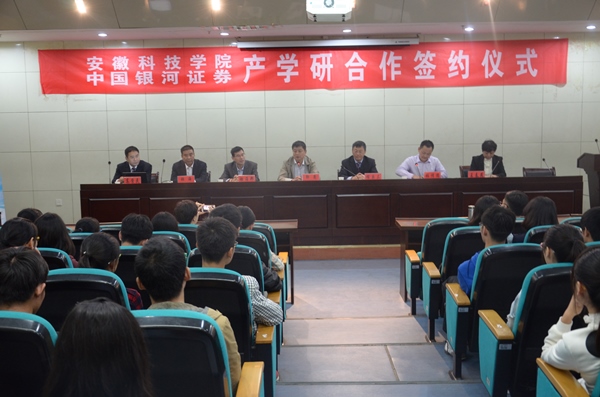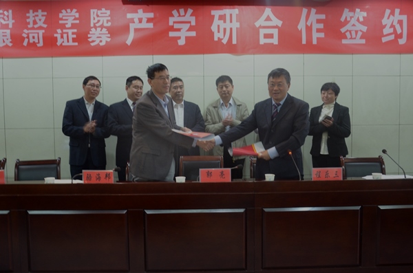 9月29日下午,财经学院与中国银河证券股份有限公司的产学研合作签约仪式在第一报告厅隆重举行。校党委委员、副校长郭亮出席会议并讲话。财经学院党总支书记骆海邦,银河证券安徽分公司总经理程乐三、协调业务部总监高学民、蚌埠营业部总经理张海等出席仪式。财经学院部分教师及2015级金融工程专业学生参加了会议。会议由财经学院党总支副书记张传德主持。