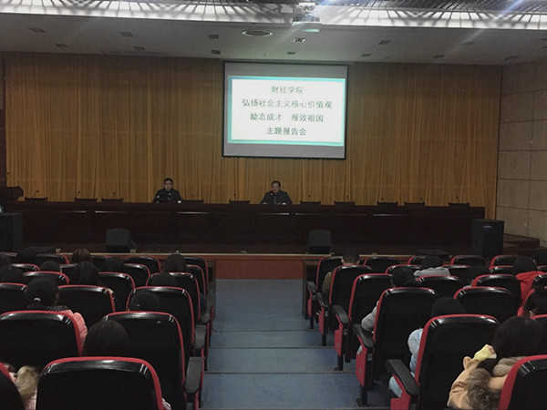 为进一步浓厚弘扬社会主义核心价值观的良好氛围,11月29日晚,财经学院邀请学生处学生资助中心主任黄钦海老师,在新图书馆二楼报告厅作了题为“弘扬社会主义核心价值观,励志成才、报效祖国”专题报告会。财经学院全体获得国家助学金、国家励志奖学金的学生聆听了报告会。报告会由学院党总支副书记张传德主持。