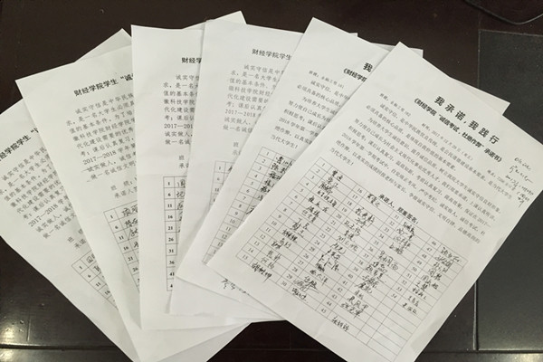 会后,各班级组织同学签署了《财经学院“诚信考试,杜绝作弊”承诺书》,郑重承诺遵守校规校纪,严格考风考纪,做一名知纪、守纪、诚信、文明的大学生。