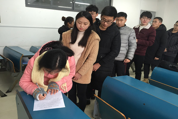 学生党员代表上台发言表示,言必信,行必果,将自觉遵守考试纪律,诚信应考,充分发挥党员的先锋模范作用。与会党员、入党积极分子共同签订了《“诚信考试、杜绝作弊”承诺书》。(特约通讯员:许欣)