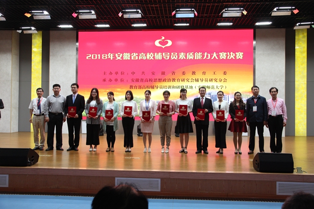 同台竞技展风采,经验分享共成长。5月12日-13日,2018年安徽省高校辅导员素质能力大赛决赛在安徽师范大学顺利举行。大赛由安徽省委教育工委主办,安徽省高校思想政治教育研究会辅导员研究分会、教育部高校辅导员培训和研修基地(安徽师范大学)承办。我校财经学院辅导员许欣经过皖北片复赛成功晋级决赛,与来自25所高校的30名选手展开激烈角逐,最终荣获决赛二等奖。
