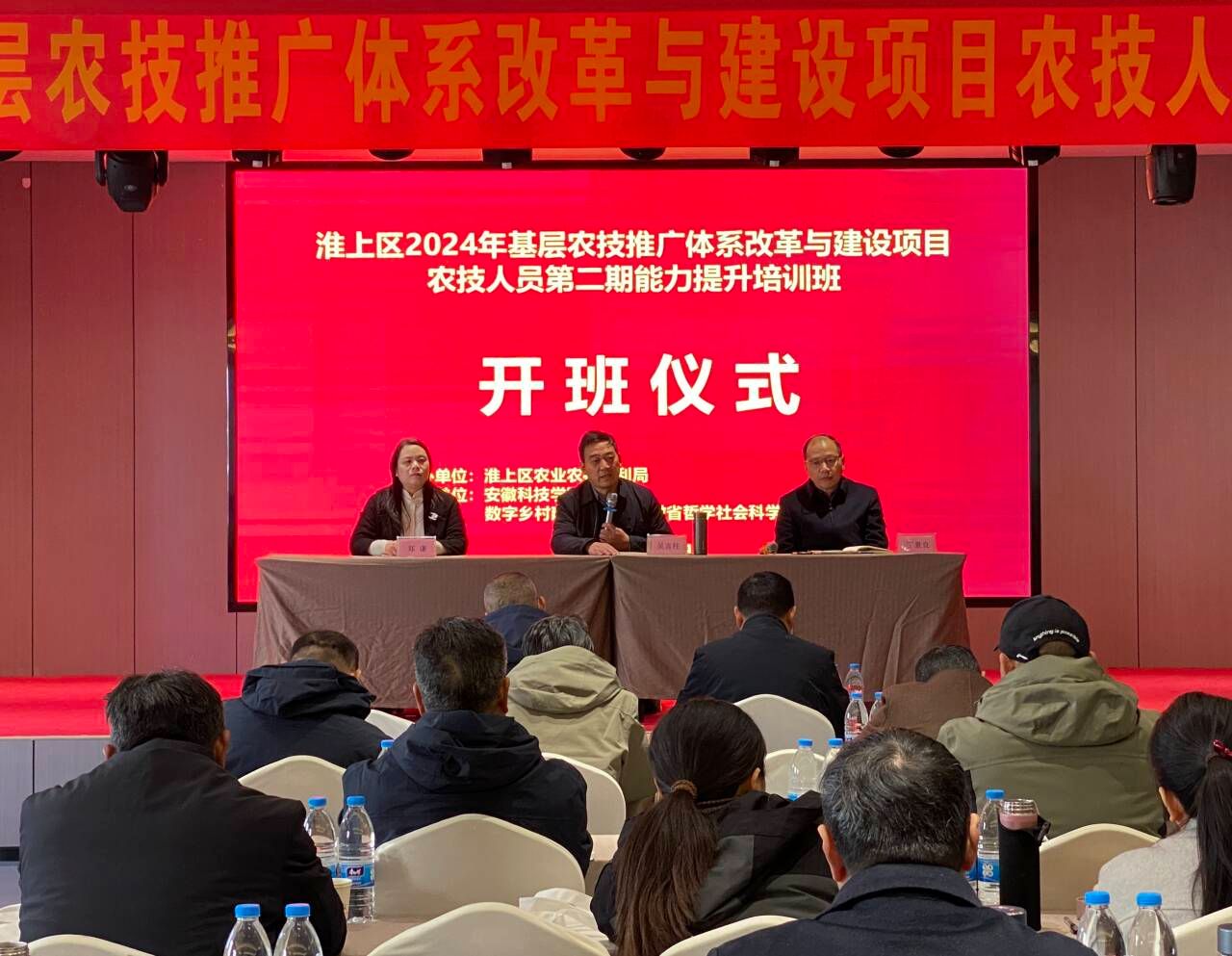 为全面推进乡村振兴,深化淮上区基层农技推广体系改革,2024年11月26日,淮上区基层农技人员第二期能力提升培训班在蚌埠市淮上区举办开班仪式。此次培训由淮上区农业农村水利局主办,安徽科技学院管理学院、数字乡村建设与安徽省哲学社会科学重点实验室联合承办,淮上区农业综合服务站站长吴言柱,管理学院党委书记丁景良,副院长郑谦出席开班仪式,仪式由丁景良主持。