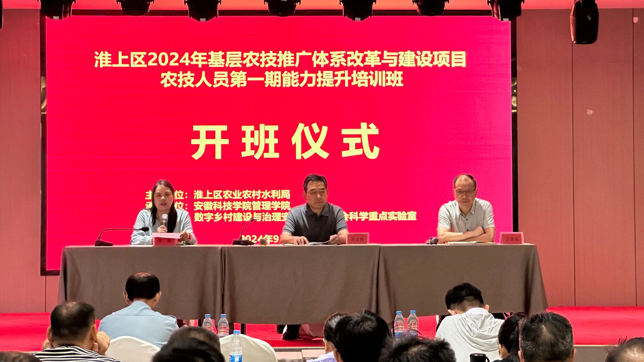 为深化基层农技推广体系改革,提升农技人员综合素质,助力蚌埠市乡村振兴。9月18日上午,由淮上区农业农村水利局主办,安徽科技学院管理学院及数字乡村建设与安徽省哲学社会科学重点实验室联合承办的“淮上区2024年基层农技推广体系改革与建设项目农技人员第一期能力提升培训班”在蚌埠市淮上区举办开班仪式。淮上区农业综合服务站站长吴言柱,管理学院党委书记丁景良,副院长郑谦出席开班仪式,开班仪式由丁景良主持。