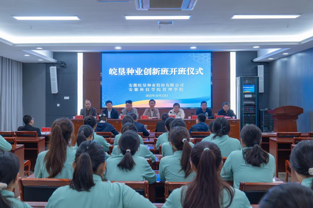 李震在讲话中对“皖垦种业创新班”的成功开班表示热烈祝贺,对安徽皖垦种业股份有限公司给予学校的高度信任和办学支持表示由衷感谢,对校企联手共同培育高素质人才模式给予了充分肯定。他指出安徽科技学院因农而生,以农见长,长期以来为国家和社会培养了一大批知识结构优、实践能力强、敬业精神强、创新创业意识强的高素质应用型人才。在全面实施乡村振兴的新时期,希望安徽皖垦种业股份有限公司利用自身的优势联合学校积极承担起种业振兴和应用型人才培养的重任,共同为农业强省做出应有贡献。希望皖垦种业创新班的全体同学要抓住机遇,利用创新班提供的平台,明确目标,刻苦学习,积极参加实践锻炼,努力成为有理想、有本领、有担当的新时代好青年。希望管理学院优化“皖垦种业创新班”人才培养方案,将此班办出特色,办出成效,办成校企合作共育英才的典范。