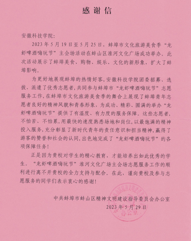 感谢信提到,安徽科技学院团委招募、选拔、派遣了优秀志愿者,共同参与蚌埠市“龙虾啤酒嗨玩节”志愿服务工作,在蚌埠市文化旅游美食季的舞合上展现了蚌埠青年志愿者良好的精神风貌和青春形象,为成功、精彩、圆满的举办“龙虾啤酒嗨玩节”提供了有温度、有力度的服务保障。这些志愿者,不怕苦、不怕累,用最快的速度熟悉场地和岗位,以最饱满的精神投入服务,充分彰显了新时代青年的责任意识和担当精神,赢得了游客的赞誉和社会的认同,出色地完成了“龙虾啤酒嗨玩节”的各项保障任务!正是因为贵校对学生的精心教育,才能培养出如此优秀的学生。“龙虾啤酒嗨玩节”淮河文化广场主会场志愿服务工作的顺利进行离不开贵校的全力支持与配合。在此,谨向贵校及参与志愿服务的同学们表示衷心的感谢。