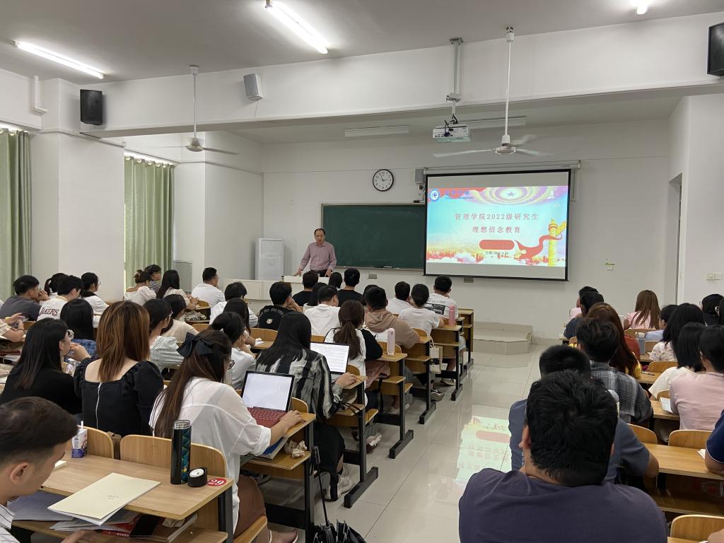 研究生新生入学教育是研究生培养的第一课,是研究生思想政治教育的重要组成部分,对帮助新生坚定理想信念、树立远大理想具有重要意义。为引导广大新生开好头、起好步,9月19日,管理学院在致知楼B403教室面向全体2022级研究生开展理想信念教育主题活动。学院党委书记丁景良应邀作主题报告,会议由副院长郑谦主持。