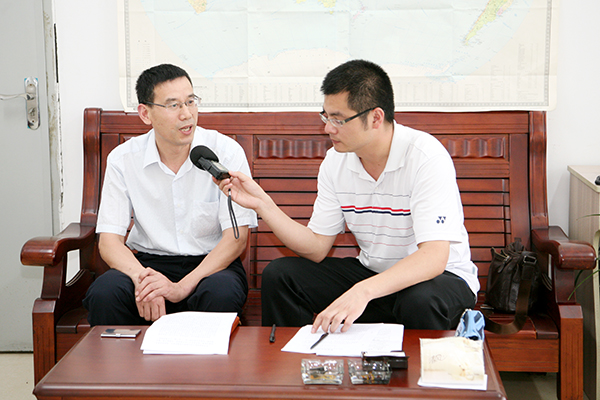 记者采访财经学院党总支书记骆海邦(左)