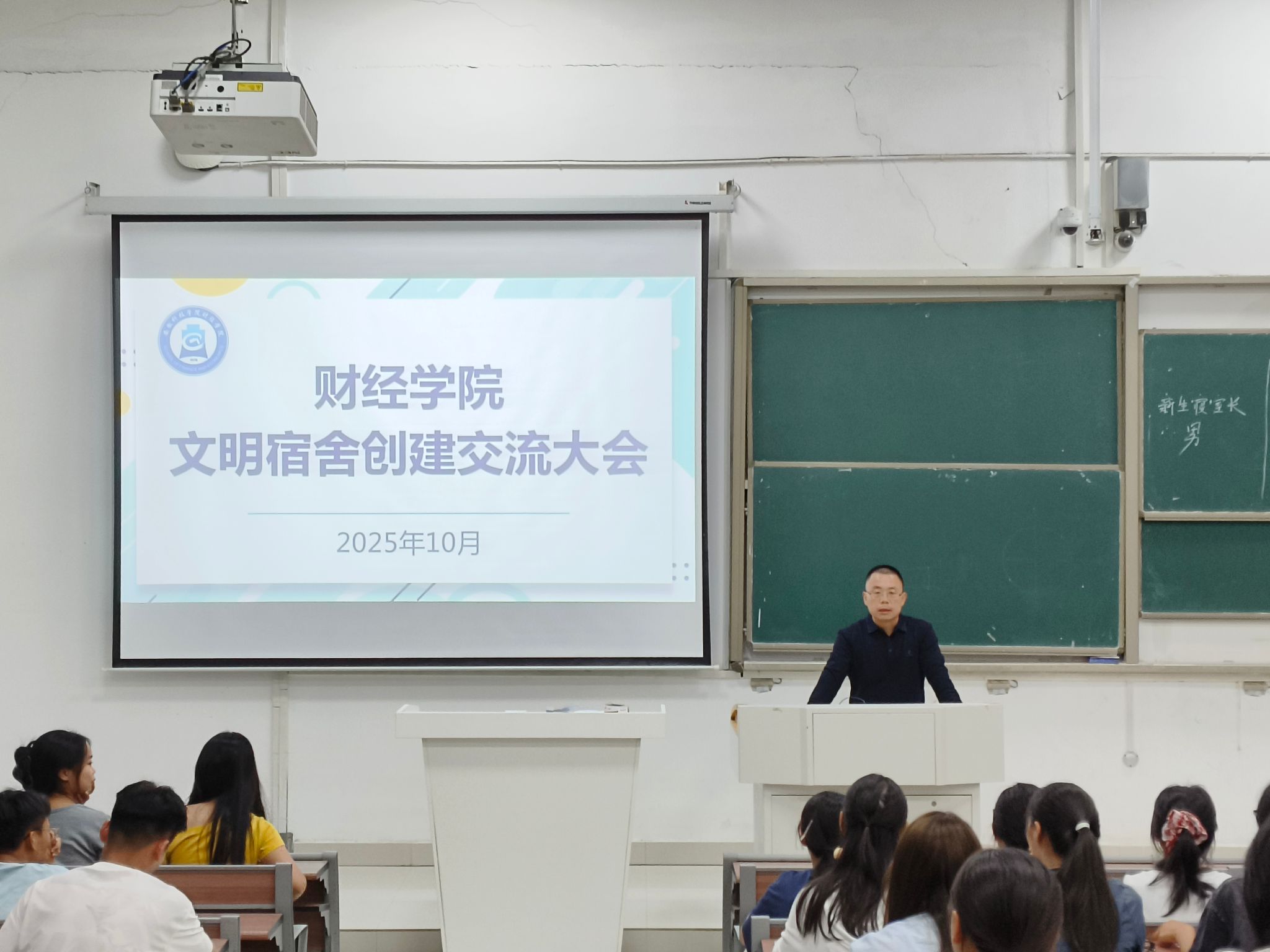 为进一步规范学生宿舍管理,营造安全、整洁、文明的住宿环境,助力优良学风与班风建设,财经学院于10月10日在致知楼B111召开文明宿舍创建交流会。学院党委副书记、纪委书记耿广汉,各班级生活委员以及2025级班长、全体寝室长参加会议,副科级辅导员姚迪主持会议。