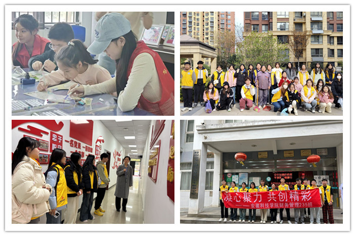 学院各团支部积极响应,深入蚌埠市不同社区开展实践和志愿服务。金工221班团支部在龙湖社区新时代文明实践站社区工作人员的带领下,对辖区商铺开展消防安全隐患大排查,同时向居民们科普用火、用电、用气等安全知识,提醒商家要定期对火灾隐患进行自查自纠,做到防患于未“燃”,筑牢安全“防火墙”。国贸241、242班团支部在工作人员带领下参观安徽省军队转业干部培训中心蚌埠分中心,了解退役士兵安置和就业政策,增强参军入伍意识。财管232、234班团支部深入天颐养老公寓,为老人们打扫社区卫生,陪老人唠家常、一同包饺子,让老人们感受到了社会的关怀和温暖。财管223团支部前往雪华乡沈圩社区,为社区儿童普及消防安全知识,共同创作关于不同民族服饰的绘画,用画笔描绘出多彩的民族风情。此外,还有不少团支部深入东升、海亮、龙湖春天、湖畔名邸等社区,开展了各具特色的社会实践活动。