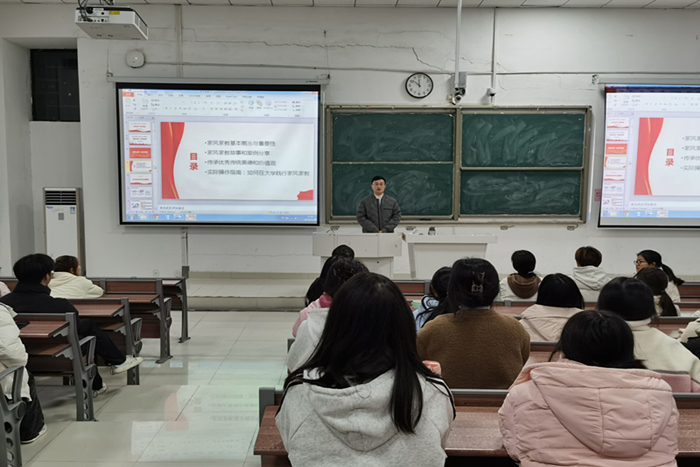 尹成超以“家风家教”为主题,引经据典,对习近平总书记“注重家庭、注重家教、注重家风”重要论述进行了深刻解读,围绕“家庭家风家训的来源与发展”“家庭家风家训案例”“中华传统文化中的家风家训”“新时代弘扬优良家风家训实践要求”四个方面,引导青年学生充分认识家庭家教家风建设的重大意义,希望学生干部们立大志、明大德、成大才、担大任,增强历史使命感和责任感,立足本职、胸怀全局,为家庭谋幸福、为他人送温暖、为社会作贡献,自觉把人生理想、家庭幸福融入国家富强、民族复兴的伟业之中,把个人梦与中国梦紧密联系在一起,奋力成为中华民族伟大复兴的时代新人。