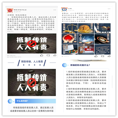 为引导广大学生认清传销本质及危害,自觉远离抵制传销,增强生命财产安全意识,营造安全稳定的校园环境,10月21日至11月8日,财经学院多种形式宣传并加强学生防范传销的教育。