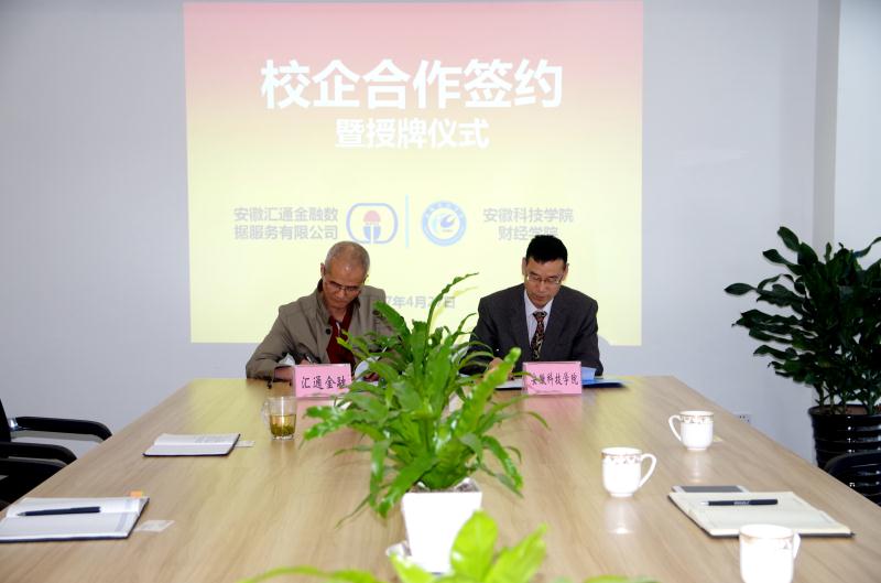 4月27日上午,校党委委员、副校长郭亮,财经学院党总支书记骆海邦等一行4人赴蚌埠大学科技园,与安徽汇通金融数据服务有限公司举行了校企合作签约仪式。安徽汇通金融数据服务有限公司副总裁、总经理潘春森先生及有关部门经理出席签约仪式。