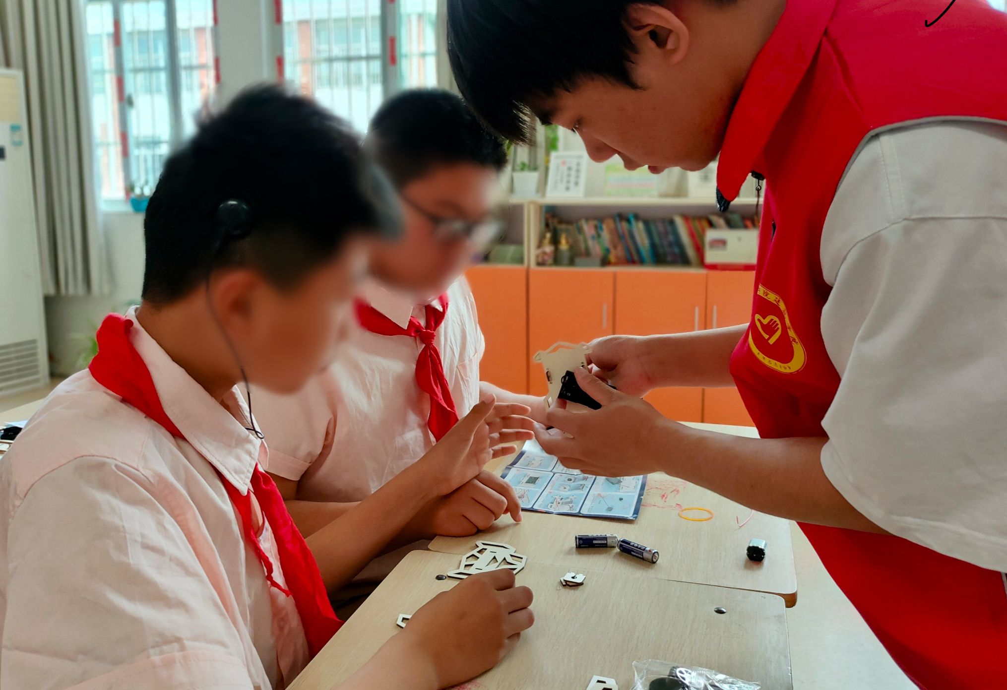 为了让孩子们更直观地体验科技的魅力,实践团特别准备了科技绘画和手工制作模型活动。在绘画环节,孩子们纷纷挑选自己心仪的底图,用五彩斑斓的颜料描绘出心中的科技世界。有的画出了高耸入云的火箭,有的画出了飞翔在蓝天中的无人机,还有的画出了繁忙的智能工厂……每一幅画都充满了孩子们的想象力和创造力。在手工制作模型环节,孩子们面临了更大的挑战。他们需要在团队成员的指导下,拆解模型原件、拼接组装、搭接电线……虽然过程中遇到了许多困难,但孩子们并没有放弃。他们互相帮助、互相鼓励,在小小的镊子和螺丝刀下,一个个精致的科技模型逐渐成形。当看到自己的劳动成果时,孩子们的脸上都露出了灿烂的笑容。