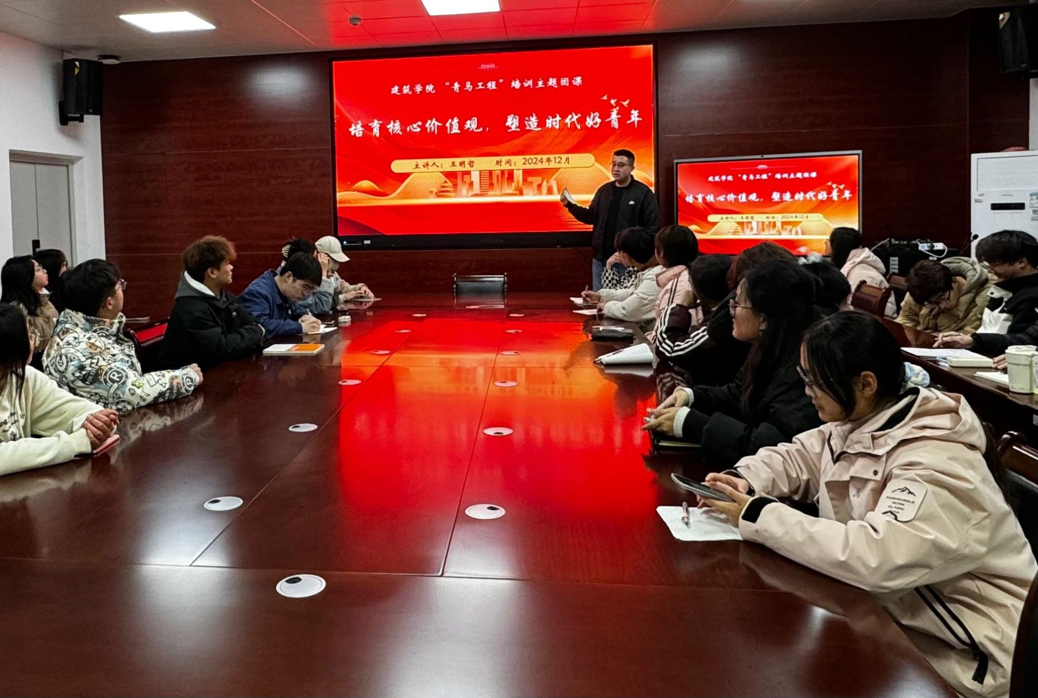 为进一步加强大学生骨干的思想建设,提升他们的政治素养和综合能力,12月11日,建筑学院在尚行楼A301举成功举办以“培育核心价值观,塑造时代好青年”为主题的大学生骨干培训, 此次培训由建筑学院专职辅导员王明哲主讲,2024级全体学生骨干参加。