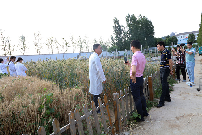 郑甲成博士向媒体介绍从欧美引进的四个粮饲兼用小黑麦品种的生态适应性和秸秆创新利用价值