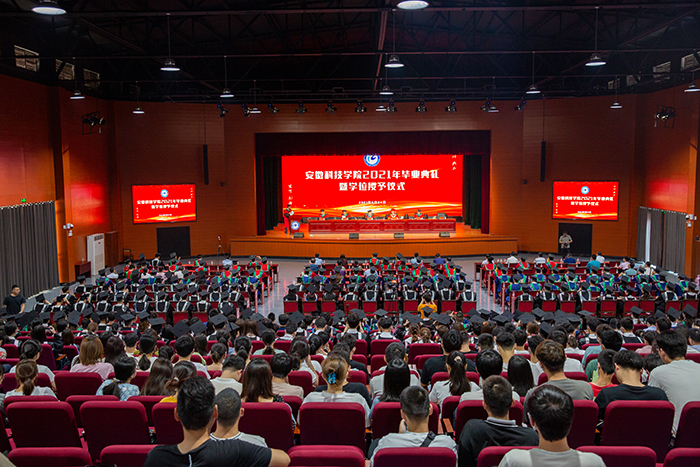 李震在典礼上致辞。他代表党委、行政和全体师生员工向顺利完成学业的2021届4749名应届本科生和120名硕士研究生致以最热烈的祝贺和最美好的祝福!向多年来为同学们成长成才付出心血和汗水的老师和家长们,表示衷心的感谢和崇高的敬意!他指出,今年是中国共产党建党100周年,是“十四五”规划开局之年,是开启全面建设社会主义现代化国家新征程、向第二个百年奋斗目标进军的重要历史交汇点。广大毕业生见证了学校四年来跻身安徽省一流大学建设行列、龙湖校区启用一校两区格局基本形成、明确了更名“安徽科技大学”、建成现代化一流应用型大学奋斗目标等一系列重大进展。李震回顾了过去四年广大毕业生的“安科时间”和成长轨迹,充分肯定了他们在学校建设、改革和发展壮大进程中的辛勤付出、大力支持和取得的骄人成绩。