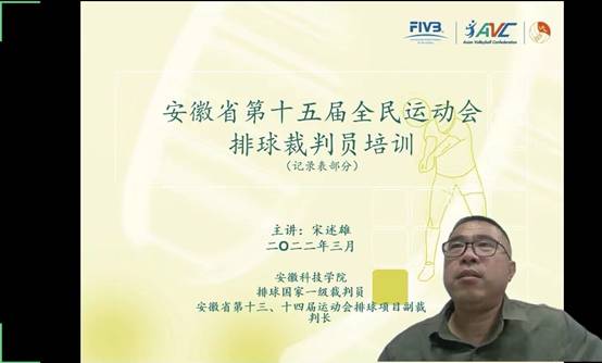 4月11-14日,安徽省第十五届运动会排球项目裁判员培训班通过线上会议的形式举行,开班仪式由奥运会获奖选手、安徽省球类运动管理中心办公室主任刘玉梅主持,来自全省各行各业的67名国家一级排球裁判员参加了本次培训。我校体育教学部宋述雄老师受大赛组委会的委派,负责排球比赛记录表部分的讲解与实践指导。