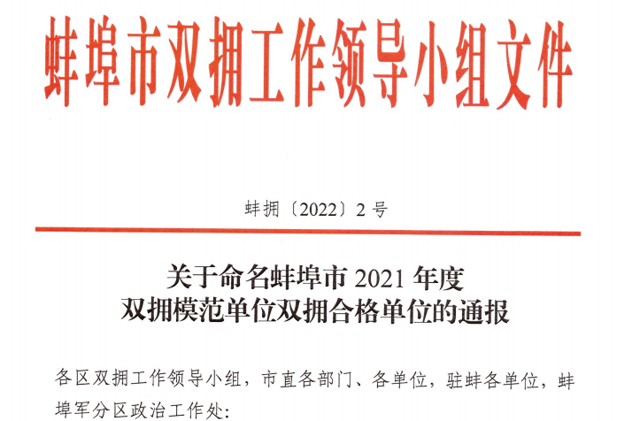 根据6月27日蚌埠市双拥办印发的《关于命名蚌埠市2021年度双拥模范单位双拥合格单位的通报》(蚌拥〔2022〕2号)文件通报,我校获评“蚌埠市2021年度双拥模范单位”称号。