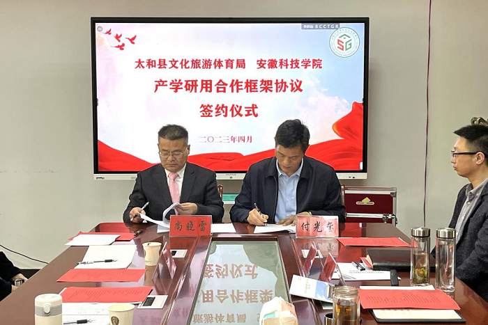 洽谈后,付光玺和尚晓雷分别代表学校、太和县文化旅游体育局共同签署了安徽科技学院科技成果转化太和分中心建设协议。