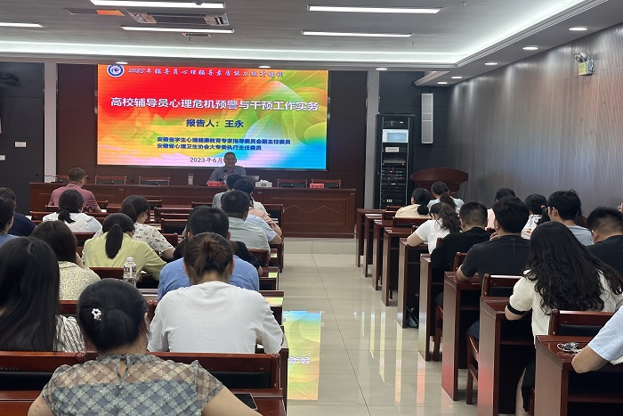 为提升辅导员心理危机干预工作水平,更有针对性地开展学生心理健康教育工作,6月17日下午,我校邀请安徽省学生心理健康教育专家指导委员会副主任委员、安徽省心理卫生协会大专委执行主任委员王永教授在龙湖校区西辅楼111为全体辅导员作题为“高校辅导员心理危机预警与干预工作实务”的专题报告,报告由学工部部长黄立义主持。全体专兼职辅导员及学生心理健康教育与咨询中心专职心理咨询师聆听了报告。