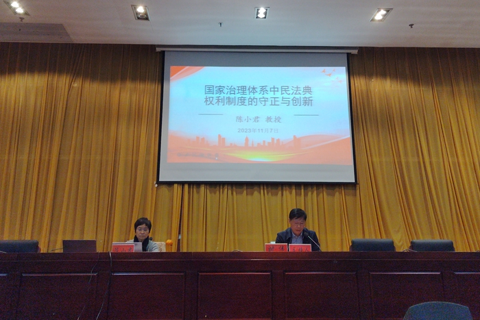 11月7日下午,广东外语外贸大学教授、博士生导师、中国民法学研究会副会长、我国著名法学专家陈小君教授应邀在会议中心二楼报告厅为我校师生作题为“国家治理体系中民法典权利制度的守正与创新”的学术报告。校党委书记时伟主持报告会。
