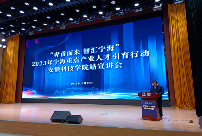 黄远友在致辞中对宁海县重点产业引才工作组表示欢迎,并简要介绍了学校办学历史、办学成就和办学愿景。他指出,近年来,宁波市、蚌埠市和我校校地、校企沟通联系不断加强,交流合作持续深化,宁波和蚌埠结对合作帮扶的“十年之约”强力开局。学校通过举办甬蚌合作专场招聘集市,同宁海县签署校地合作战略框架协议,持续深化人才培养、产学研合作、课题攻关、科研创新等方面合作,协同推进人才培养质量提升,双方合作成果丰硕。他强调,希望毕业生能够充分利用宁海引育人才的优渥政策,将职业理想落地生根。