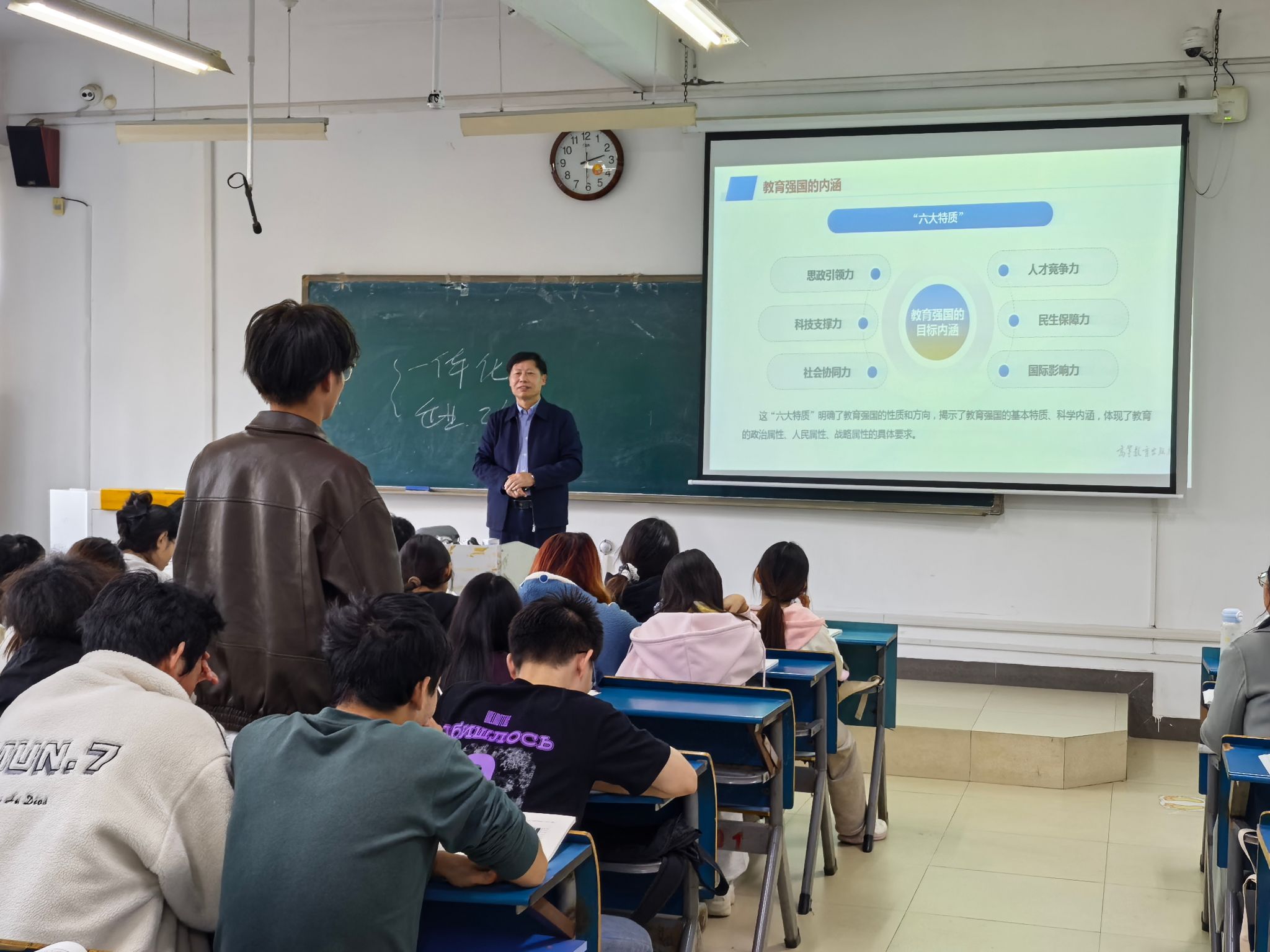 课堂上,时伟围绕“办好人民满意的教育”这一专题,结合党的二十大和二十届三中、四中全会精神,从历史逻辑、理论逻辑和实践逻辑三个方面,运用大量翔实数据,深入讲授教育是民族振兴和社会进步的基石,教育兴则国家兴、教育强则国家强,激发学生共同探索如何建设教育强国,引导青年学生立报国强国大志向、做挺膺担当奋斗者。