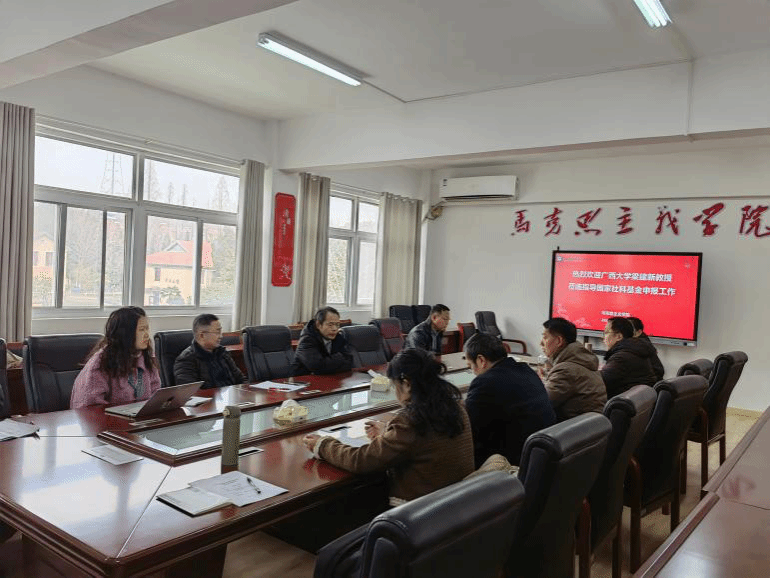 为进一步推动2026年度国家社科基金项目申报,切实提升项目申报的质量与立项竞争力,2月7日下午,学院在学知楼324会议室召开国家社科基金申报辅导会,邀请广西大学马克思主义学院副院长、博士生导师梁建新教授莅临指导。院长张德化主持会议,各国家社科基金项目的申报人参加会议。
