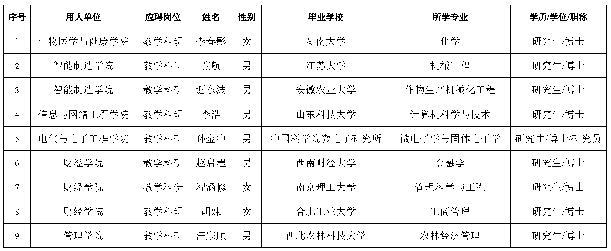 根据《安徽省事业单位公开招聘人员暂行办法》(皖人社发〔2010〕78号)、《关于进一步做好省属高校公开招聘工作的通知》(皖人社秘〔2018〕369号)以及相关文件精神,经考核,李春影等9位高层次人才符合我校2025年高层次人才拟聘用条件,现予以公示。