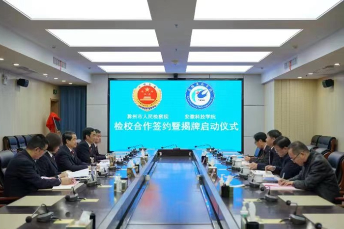时伟介绍了安徽科技学院基本校情及近年来改革、建设与发展情况,并围绕党建聚焦五个方面重点工作,落实好六大着力点等进行交流。他期待双方围绕高校五大职能,通过校检共建,建立完善的常态化合作机制,在人才培养、业务培训、专家互聘、案件办理、理论与实务研究等方面深入合作,为法治滁州建设贡献安科力量。