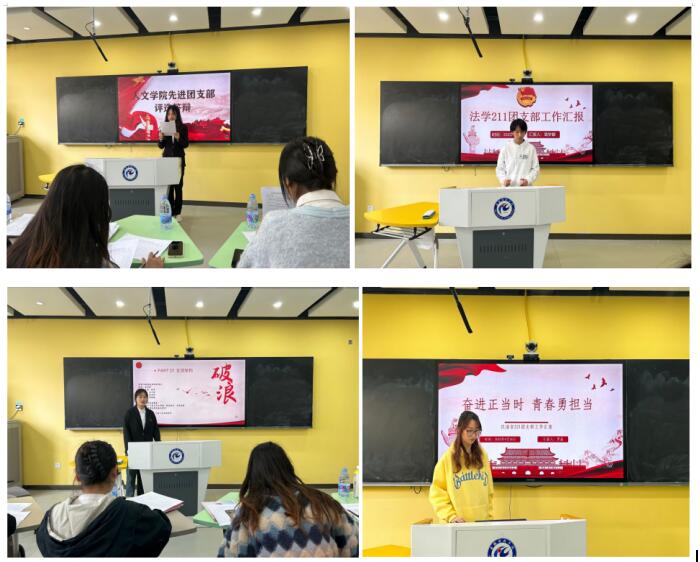 会议伊始,由各班团支部对支部基本情况进行了介绍。他们建设完整,分工明确,责任明晰,并在团支书的统一指导下,有序开展了各项活动,班级成员也积极参与学校组织的各项活动,并取得了优异成绩。会议过程中,各班团支书就PPT从思想引领、自生组织建设、团日活动开展等方面进行了述职汇报,同时对目前需要不断完善的方面进行了阐述,以及对未来团支部工作计划进行了展望。评委们听取各团支书的述职汇报并浏览提交的团支部工作手册后,提出了切实可行的改进方案。