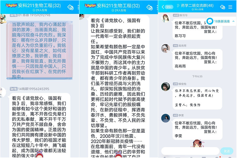 学院各团支部陆续开展了“强国有我 请党放心”主题团日活动,内容丰富,形式多样。部分团支部通过观看相关视频组织开展学习会,锤炼了同学们的优良品德,他们还通过班级官Q开展了本次主题团日活动,让同学们参与讨论,使同学们更加深入了解“七一”重要讲话的精神内涵;还有一部分团支部采用了PPT的形式开展主题班会,增长同学们对党的相关知识的学习;另外,一些团支部因实习等原因采用线上观看相关材料并发表观后感方式开展主题团日活动。