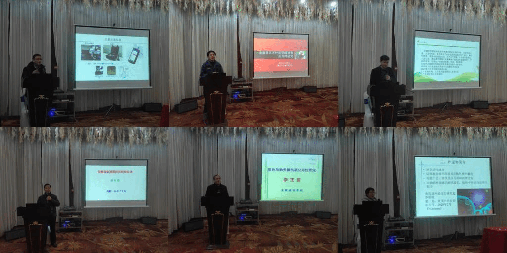 中国科学院合肥物质科学研究院黄青研究员,安徽大学吴旺宝教授,砀山县亲耳菌业有限公司蒋鹏总经理,安徽科技学院何华奇副教授、李正鹏教授、蒋圣娟教授等九位专家,分别做了“灵芝多糖和三萜成分光谱检测方法研究”、“金寨县灵芝种质资源调查及育种研究”、“砀山县果枝木耳扶贫经验交流”、“安徽省食用菌产业扶贫经验交流”、“羊肚菌栽培高产环境因子研究”、“紫色马勃多糖抗氧化活性研究”、“猴头菇外泌体初步研究”等专题报告。