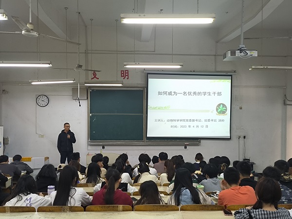 为提升学院学生干部素质,增强学生干部的工作能力。4月16日下午,动物科学学院在求知楼A107教室举行团校暨学生干部培训班第三讲《如何成为一名优秀的学生干部》。学院党委副书记、纪委书记汤帅担任此次主讲,学院团校培训班全体成员、各班级思政委员共同参加本次培训。