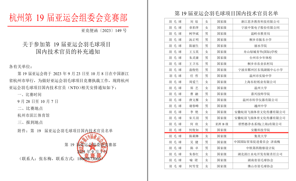 何俊如作为中国羽毛球协会裁判员委员会委员、中国羽毛球协会体教融合委员会委员、羽毛球国家级裁判员、教练员、考评员和社会体育指导员,多次担任世界羽毛球混合团体锦标赛、亚洲羽毛球锦标赛等国际比赛技术官员和全国运动会、安徽省运动会的羽毛球赛等国家和省级比赛的裁判长和赛事监督等工作。何俊如老师在第19届亚运会羽毛球比赛中充分展现了我校教师良好的专业技能和敬业精神,为亚运会贡献了安科力量。(特约通讯员:王杰 审核:王松华)