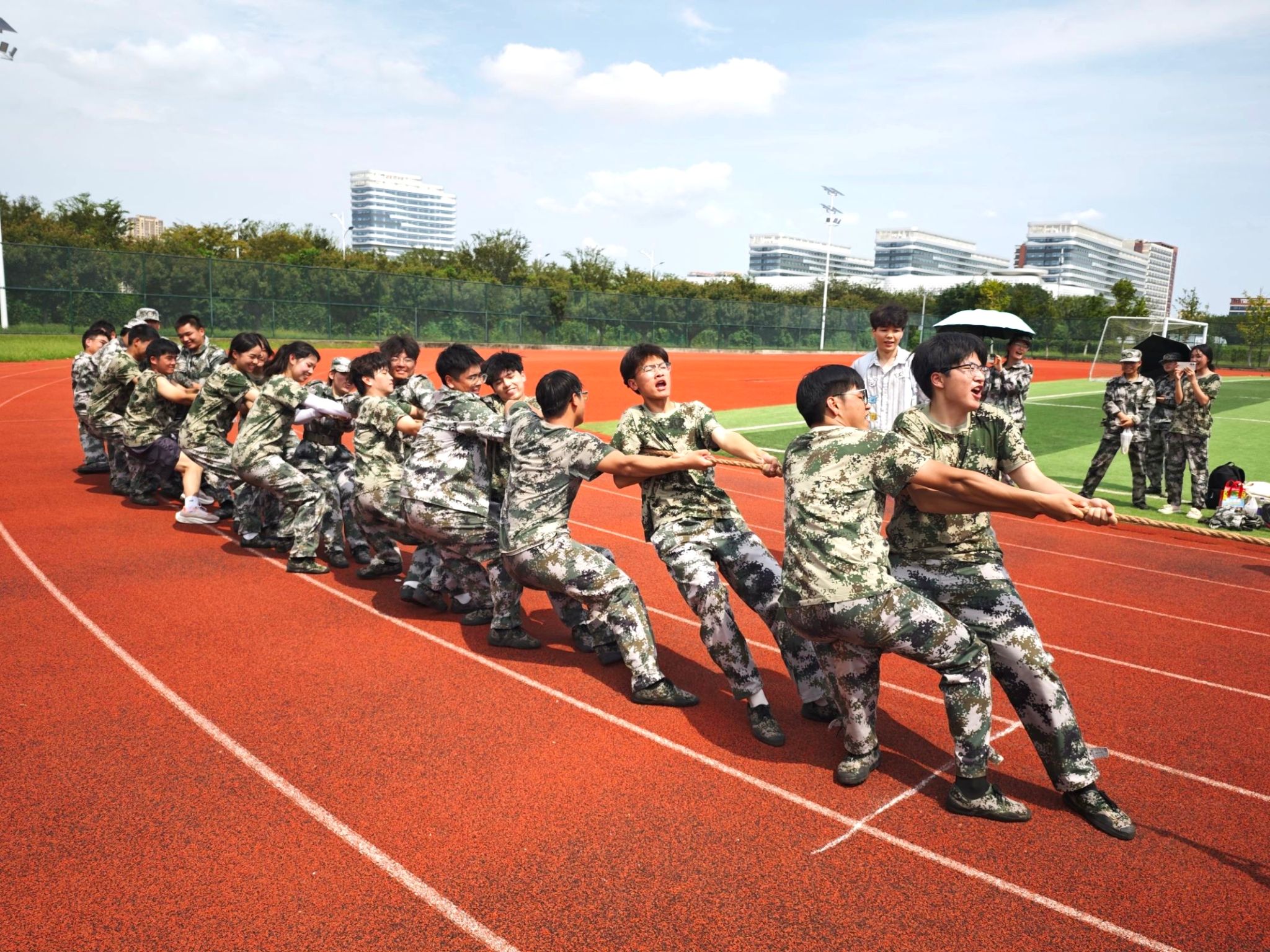 比赛以班级为单位开展,学院12支新生班级参赛队伍同场竞技。裁判哨声一响,比赛正式开始,正午的北操场气氛瞬间被点燃,助威声与欢呼声回荡在整个赛场。参赛队员紧握绳索、稳扎马步,凭借整齐的口号与默契的配合凝聚力量,在反复拉锯中展现出坚韧的意志与强烈的集体荣誉感。经过数轮激烈交锋,最终网络工程254班凭借出色表现获得一等奖,计算机科学与技术252班获得二等奖,网络工程253班获得三等奖。