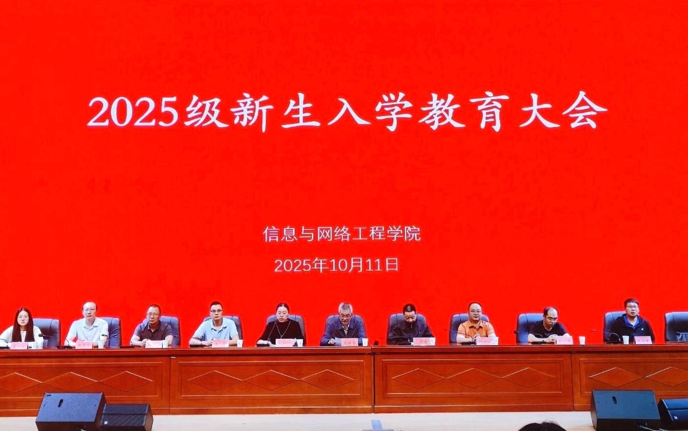 10月11日中午,信息与网络工程学院在信息中心东辅楼二楼报告厅召开2025级新生入学教育大会。学院党政领导、各系室主任、教师代表莫佳丽、全体辅导员及2025级全体新生参加会议。会议由学院党委副书记韦乃学主持。