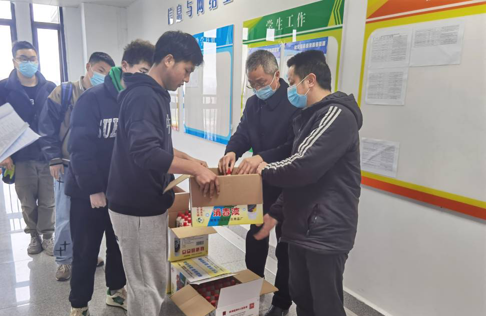 王振其、余宏杰在疫情防控消杀物品发放现场,给每一间宿舍的学生代表发放84消毒液消杀物品,并叮嘱学生们要充分认清当前疫情防控的艰巨性、复杂性、反复性,摒弃一切侥幸的心理、麻痹大意的思想,增强对疫情防控的敏感性,要做好每日宿舍卫生消杀工作、严格执行“日报告”、“零报告”制度、晨午晚体温检制度,提高自我防护意识和能力,积极广泛地宣传疫情防控知识,努力形成全体师生思想同心、行动同步、共同抗疫的良好局面,守住美丽校园疫情“零输入”底线。