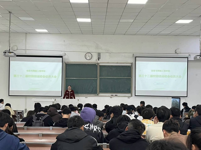 为了保障运动会志愿服务有序进行,鼓舞我院运动员的士气。11月7日中午,信息与网络工程学院在致知楼C111召开校第三十二届运动会赛前动员大会。学院党委副书记韦乃学、学生会指导老师崔北坤出席本次会议,全体运动员、学生会成员、各班班长以及体育委员参加了本次会议,会议由崔北坤主持。